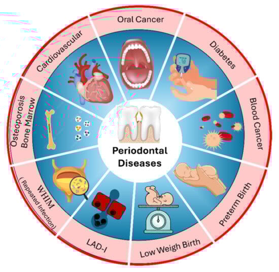Illustration of possible links between periodontal diseases and other diseases. Including oral cancer, cardiovascular diseases, osteoporosis, diabetes, preterm birth, low-weight birth, WHIM syndrome, LAD-I, and blood cancer.