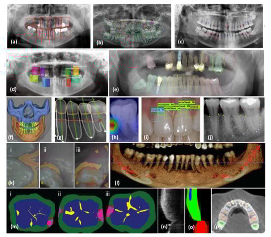 Different AI models that have been applied on a variety of dental and maxillofacial imaging radiographs included in this study [73,89]: (a) periodontal bone loss detection using Fast R-CNN. The red boxes are the output of the model for ROI detection (reprinted from Ref. [74]), (b) panoramic radiograph segmentation with U-Net (reprinted with permission from Ref. [75], copyright (2024) IEEE), (c) detection of bone loss patterns and furcation with U-Net (reprinted from Ref. [76]), (d) periodontal compromised teeth detection using Fast R-CNN (reprinted from Ref. [77]), (e) dental formula and prosthetics detection with Apox software. The image depicts various dental components, including dental formulas, implants, prosthetic crowns, fillings, root remnants, and root canal treatments (reprinted from Ref. [78]), (f) CBCT image segmentation with Relu software (reprinted from Ref. [79]), (g) bone loss assessment with DL models (reprinted from Ref. [80]), (h) XAI heat maps on periapical images (reprinted from Ref. [81]), (i) a deep learning-based approach for the detection of early signs of gingivitis in orthodontic patients using faster region-based convolutional neural networks (reprinted from Ref. [90]), (j) CEJ, AEAC, and APEX localization using Modified 2D-CNN (reprinted from Ref. [83]), (k) gingival disease segmentation. Examples of segmentation results on the validation set are shown in i–iii (reprinted from Ref. [84]), (l) 3D CBCT image reconstruction showing bone loss (reprinted from Ref. [85]), (m) caries detection with U-Net. Examples of segmentation results on the validation set are shown in i–iii (reprinted from Ref. [86]), (n) an example of a OCT image (reprinted from Ref. [87]), and (o) its segmentation with OCT Image Net (reprinted from Ref. [87]), (p) tooth instance segmentation from CBCT images using ToothNet (reprinted from Ref. [88]).