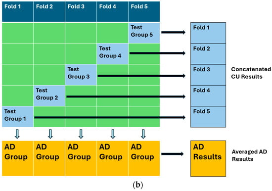 During the training stage, models were trained on the designated training subset. Upon completing their training, each model was then applied to both the patients with AD dataset and the CU testing subset to predict brain age. In the subsequent 5-fold iterations, depicted in Figure 1b, 20% of the CU data was removed for testing in each iteration, allowing for thorough testing across the entire available CU data and repeated testing over the AD group. The results from these iterations were averaged after each fold. In total, 25 iterations were performed, with the results averaged again to further reduce randomness.
