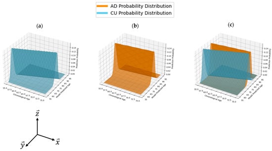 Probability distribution functions (PDFs) modeled to ref. CU and AD prediction distributions: (a) PDF of age predictions for CU individuals; (b) PDF of age predictions for patients with AD; (c) two PDFs overlaid on each other. The z-axis describes the probability of a model making a prediction for a given individual’s chronological age. Similarly to further figures, the x-axis represents an individual’s chronological or real age, while the y-axis describes their model-predicted age.