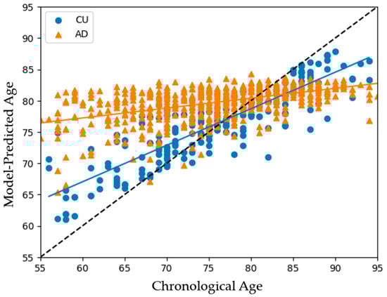 Figure 3 presents the brain estimate age versus chronological age results for all subjects, including the 1100 CU individuals and 602 patients with AD. The black dashed line represents the regression line between each individual’s chronological age and their estimated brain age. Data points above this line indicate an older brain age relative to chronological age, and points below indicate a younger brain age. The LOBF for CU and AD are shown in blue and orange, respectively. The graph illustrates that patients with AD typically exhibit significantly older brain ages compared to CU individuals between 55 and 75 years of age, with BADs of 6.5–10 years separating the two groups. These highlight the accelerated brain aging in patients with AD relative to their chronological age.