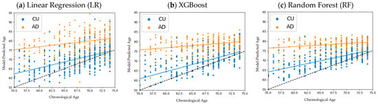 We first compared the following three models: RF, XGBoost, and LR. The BAD, ID value, and STD of the CU and AD prediction distributions are shown in Table 3, with the STDs being calculated about each distribution’s respective LOBF. We found that the ID values of RF (0.762) and XGBoost (0.75) were far larger than that of linear regression (0.604), indicating clearer separation between the CU and AD distributions using RF and XGBoost. The corresponding scatterplots are shown in Figure 4; LR had the largest variations in age predictions, while RF returned the lowest STDs for its predictions. Despite the RF model generating smaller BADs, its tighter distributions led it to generate the highest ID values among the three models.
