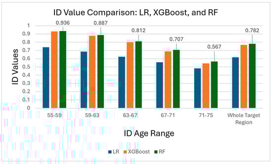 The ID values were further examined in smaller four-year increments (Table 4). Figure 5 compares the ID values calculated for each model across the different age ranges. These incremental ID values indicate that XGBoost performed marginally better at the lower end of the target age range, while RF scored significantly higher in ID values for age groups, where the concentration of tested individuals was greatest. Given its highest ID values and superior precision, we concluded that RF was the best model for indicating AD and, therefore, continued using RF for the remainder of the study.