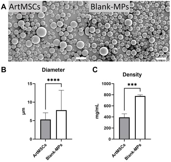The ArtMSC and Blank-MP morphologies are shown in Figure 2A, demonstrating relatively uniform spherical shapes of microspheres in both groups. However, the diameters of the ArtMSCs were 5.31 ± 1.81 µm and the Blank-MPs were 7.85 ± 5.37 µm (n = 10,000 MPs per sample, p < 0.0001). Additionally, the ArtMSCs had a density of 393.3 ± 63.0 mg/mL while the Blank-MPs had a density of 776.9 ± 21.6 mg/mL (n = 3, p = 0.0006). Thus, the ArtMSCs were smaller and less dense than the Blank-MPs, as shown in Figure 2B,C.