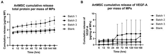 An initial burst release of protein cargo was observed within the first 6 h of incubation of the ArtMSCs (Batch 1: 2.287 ± 0.146 µg/mg of MPs, p = 0.0027, Batch 2: 1.587 ± 0.127 µg/mg of MPs, p = 0.0053, and Batch 3: 1.735 ± 0.059 µg/mg of MPs, p < 0.0001) compared to Blank-MPs with no burst protein release (0.000 ± 0.000 µg/mg of MPs) (Figure 3A). This burst release contributed to anywhere from 64.79 to 89.21% of total protein released. VEGF-A was detected within this burst release of protein cargo (Batch 1: 1.217 ± 0.142 µg/mg of MPs, p = 0.0017, Batch 2: 1.137 ± 0.453 µg/mg of MPs, p = 0.1209, and Batch 3: 0.897 ± 0.778 µg/mg of MPs, p = 0.4520) (Figure 3B). Only the Batch 1 release had significant levels of VEGF-A detected, and burst release contribution was more variable, ranging from 22% to 100% of total VEGF-A released over the 7-day period. There was no detectable uPA in any ArtMSC releasates and no distinguishable difference in uPA activity in the CM compared to the nCM (Figure S1).