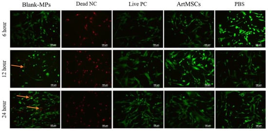 ArtMSCs did not induce SMC toxicity. ArtMSCs and Blank-MPs were incubated with SMCs for 6, 12, and 24 h, after which the SMCs were incubated with a fluorescent LIVE/DEAD assay. Green cells indicate live cells while red cells indicate dead ones. Blank-MPs caused some cytotoxicity at 12 h and 24 h, as indicated by the red cells shown by the orange arrows. The cell death control (Dead NC using diH2O) and live cell control (Live PC using SBM) both indicate that the LIVE/DEAD stain was functional.
