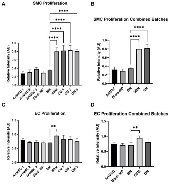 The ArtMSC releasates did not increase SMC proliferation following 24 h of culture (Figure 5A,B) compared to BM. The CM for all three batches resulted in more SMC proliferation (Batch 1: 0.821 ± 0.124 AU, p < 0.0001, Batch 2: 0.829 ± 0.112 AU, p < 0.0001, Batch 3: 0.807 ± 0.042 AU, p < 0.0001) compared to BM (0.352 ± 0.029 AU) (Figure 5A). Also, combining all three batches of CM (0.819 ± 0.087 AU, p < 0.0001) demonstrated overall greater SMC proliferation compared to BM (Figure 5B). The CM did not change EC proliferation (Figure 5C,D); these results are also outlined in Table S1.
