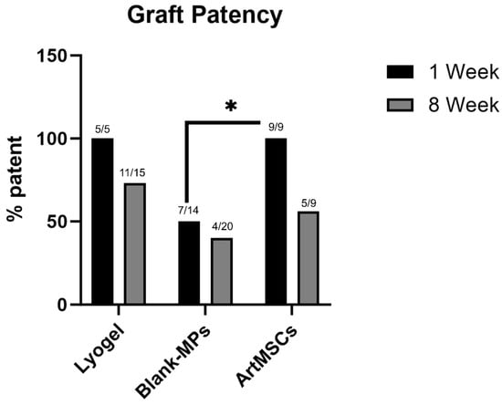 ArtMSC-loaded grafts promoted acute patency at 1 week. In 1-week grafts, ArtMSC-loaded grafts had significantly higher patency (100% (5/5)) compared to Blank-MP grafts (50% (7/14)). There was a trend toward a decrease in patency at 8 weeks for all groups compared to week 1, but no difference in patency across groups. * = p < 0.05.