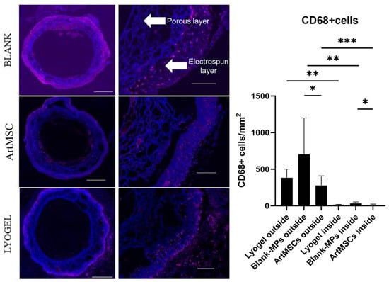 In Figure 7, two distinct layers of 1-week explants are shown: the inner porous layer and the outer electrospun layer. There was a higher concentration of macrophages (indicated by pink coloration in Figure 7) in the outer electrospun layer of the graft compared to the inner porous layer in all three groups: ArtMSCs (n = 9) (outside: 277.4 ± 132.2 vs. inside: 13.1 ± 10.5 CD68+ cells/mm2, p = 0.0003), lyogel (n = 4) (outside: 382.8 ± 119.4 vs. inside: 14.5 ± 4.4 CD68+ cells/mm2, p = 0.0228), and Blank-MPs (n = 11) (outside: 704.9 ± 495.1 vs. inside: 33.4 ± 20.3 CD68+ cells/mm2, p = 0.0004) (Figure 7). There was a significantly lower number of macrophages on both the outside (p = 0.0355) and inside (p = 0.0222) regions of the ArtMSC grafts compared to the Blank-MP grafts.