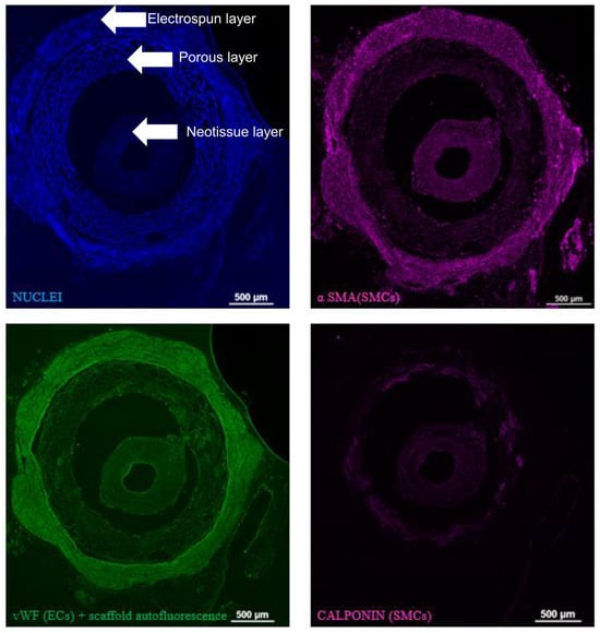 As indicated in Figure 8, three distinct layers of 8-week explants can be seen: the inner neotissue layer, middle porous layer, and outer electrospun layer. When comparing between representative IFC images of the 8-week explants, the ArtMSC grafts demonstrated higher fluorescent signal of calponin and α-SMA compared to the lyogel and Blank-MP grafts, indicating a larger presence of contractile SMCs. Some minor delamination occurred between the various layers of the graft, but this is most likely an artifact of processing the grafts. This delamination has been seen previously in both silk grafts and other grafts from our group [,]. Delamination of TEVGs has also been reported by other groups [,,]. The ArtMSC grafts also demonstrated a higher fluorescent signal of vWF than the controls, indicating a larger presence of ECs (Figure 9). At 8 weeks, IFC images demonstrated the presence of α-SMA and calponin, indicating contractile SMCs and vWF, indicating ECs within the neotissue layer of the ArtMSC grafts (Figure 10); this representative image also showed some stenosis. Figure 10 separates out the different colored channels to see the signal of different stains. The majority of cells were found in the neotissue layer and electrospun layer. This cellularity was further confirmed by hematoxylin and eosin (H&E) staining while Verhoff–Van Gieson (VVG) staining demonstrated early ECM formation within the neotissue layer (Figure 11).