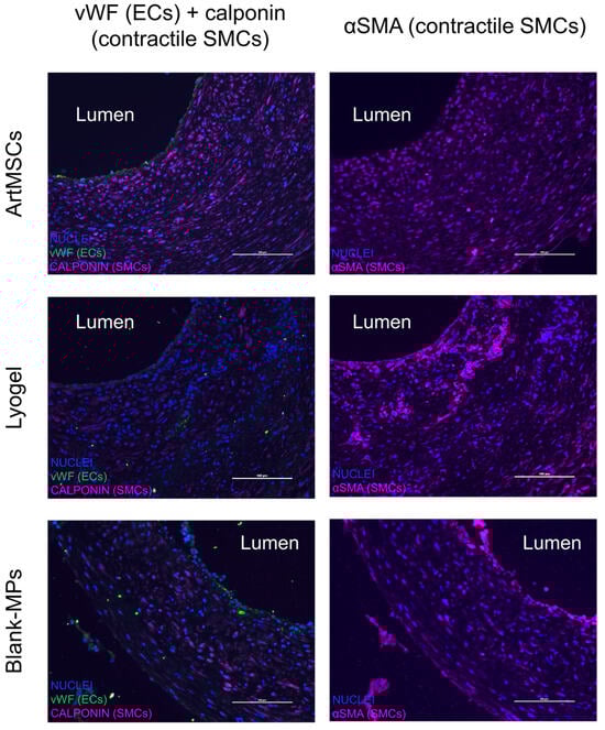 ArtMSC grafts promoted the recruitment of contractile smooth muscle cells and endothelial cells within the inner neotissue layer of TEVGs. Comparison of immunofluorescent staining between a representative ArtMSC explant and representative unloaded lyogel and Blank-MP-loaded explants at 8 weeks showed higher signal of contractile SMCs stained with calponin (first column, pink) and α-SMA (second column, pink) within the inner most tissue layer. An endothelial lining was also detected using vWF (first column, green), indicating endothelial incorporation into the ArtMSC grafts but not as strongly in the controls. Scale bar = 100 µm.