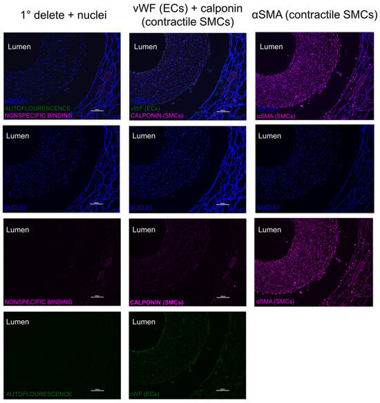 Explants were prepared according to previous protocols []. The middle portions (3–5 mm) of the grafts were fixed in 2% paraformaldehyde for 1.5 h and then washed in PBS. These sections were then fixed and embedded in paraffin. The samples were then immunofluorescently (IFC) stained for three different cell types associated with remodeling of an implanted construct toward a TEVG. First, contractile vascular smooth muscle cells were identified using calponin (1:100 ab46794, Abcam, Cambridge, UK)/Cy5 (1:100 ab150075, Abcam) and α-smooth muscle actin (1:100 ab7817, Abcam)/Cy5 (α-SMC 1:100 ab234082, Jackson ImmunoResearch Laboratories, West Grove, PA). Endothelial cells were identified using the von Willebrand Factor (vWF) preconjugated with FITC (1:100 ab195028, Abcam). Macrophages were stained with CD68 (1:100 ab31630, monoclonal, Abcam)/Cy5 (1:100 ab234080, Jackson ImmunoResearch Laboratories). Histochemistry was performed to observe cellularity (via hematoxylin and eosin (H&E)) and elastic fiber formation (via Verhoeff–Van Gieson (VVG)).