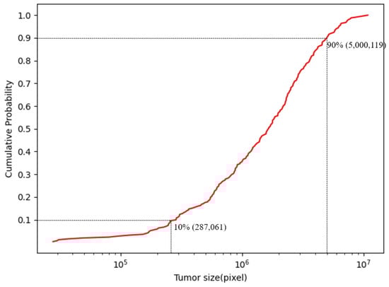 Moreover, compared with other types of medical image lesions, fundus tumors have the characteristics of varying lesion sizes and irregular lesion edges. As can be seen from Figure 1, the edges of the tumor lesions are irregular, and the overall shape of the lesions is also irregular. Figure 2 shows the cumulative distribution function of the size of tumor lesions in the FTS dataset, from which it can be found that the size of the largest and smallest tumors in the entire dataset can differ by more than a hundred times, and most of the lesion sizes are distributed in the range of 287,061 pixels to 5,000,119 pixels, which also differs by about 12 times. Consequently, the segmentation of fundus tumors is a very challenging task.