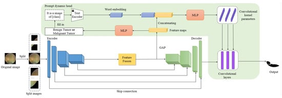 A prompt is a sentence composed of English words: it is a image of lesion class. For our current task, there are two types of lesions, namely benign and malignant tumors. The classification of the tumors is derived from a classification network, which processes the feature maps output by the feature fusion module through a multilayer perceptron, ultimately obtaining the classification result for the image. Subsequently, the classification result is filled into the prompt template to obtain the final prompt sentence. The prompt is encoded through the text encoder of the CLIP model to obtain a word embedding vector prompt. The feature map F is first subjected to a GAP operation and then concatenated with the vector prompt to obtain a new vector proF. The new vector proF is computed through a module Cont consisting of three linear layers to obtain the convolution kernel parameters and bias parameters of the three convolution layers in the final segmentation head. So the final prediction of the model is
