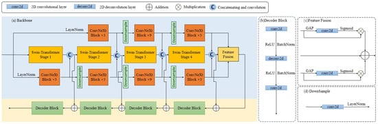 Detailed Backbone Network structure: (a) Backbone. This contains the encoder module, decoder module, and the feature fusion module. (b) Decoder Block. This component primarily comprises 1 × 1 convolutions, 3 × 3 transposed convolutions, and sequential 1 × 1 convolutions. (c) Feature Fusion. Feature fusion input in top-to-bottom order is the same as the output in encoder top-to-bottom order (d) DownSample. The downsampling operation is mainly performed by the convolution. Specific parameter settings are the same as ConvNeXt.