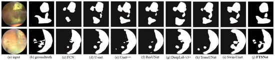 The models evaluated include FCN [30], U-net [8], Unet++ [9], ResUNet [11], DeepLab v3+ [16], TransUNet [17], Swin-Unet [31], and FTSNet, and specific results can be found in Table 2. Each model’s performance is quantified by its respective mIoU and mDice scores, which are crucial indicators of segmentation accuracy. The results demonstrate a range of performance levels, with FTSNet achieving the highest scores of 0.8254 in mIoU and 0.9042 in mDice, suggesting its superior performance in the task of image segmentation. FTSNet shows an improvement of approximately 1.49% over Swin-Unet in terms of mIoU and about 1.90% in terms of mDice.
