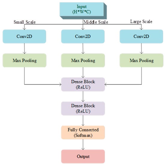 The input to the MSCNN is a coupled feature matrix of size . First, the input feature matrix is convolved with kernels of three different sizes to extract features at multiple scales, with a ReLU activation function applied after each convolution layer for nonlinear mapping. Subsequently, the convolution results in undergoing max pooling to reduce spatial dimensionality, lower the risk of overfitting, and retain critical feature information. The pooled results from the three convolution branches are concatenated along the channel dimension to form a multi-scale feature map, which is then inputted to the next layer. During the feature reorganization and classification stage, the concatenated feature map is fed into a densely connected layer, where ReLU activation is employed to further capture inter-feature relationships. Finally, the fully connected output layer uses a Softmax activation function for binary classification, alleviating the vanishing gradient problem and improving classification accuracy.