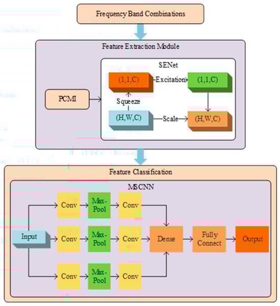 First, the PCMI method extracts nonlinear spatial features from EEG signals, converting them into feature matrices across different frequency bands to capture inter-regional coupling information. Next, the SENet module applies adaptive weighting to these frequency band features, emphasizing critical frequency bands. Finally, the MSCNN module performs multi-scale convolution processing on the vital frequency band features, using convolution kernels of different sizes to extract both local and global features, enhancing the model’s adaptability to information at various scales.
