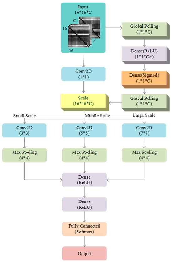 Although CNNs are traditionally applied to image data, their ability to extract hierarchical spatial features makes them well-suited for EEG analysis when the signals are transformed into structured spatial feature matrices. By representing EEG signals as channel matrices derived from PCMI, CNNs can leverage their convolutional layers to capture both local and global spatial dependencies across brain regions. This approach complements the temporal resolution of EEG signals and enhances classification performance in spatial cognition tasks [39,40]. The MSCNN overcomes the limitations of traditional CNNs in handling scale variation by extracting local and global features using convolutional kernels of different sizes [41,42,43]. However, existing multi-scale approaches still face challenges related to feature weight imbalance in small-sample conditions [44], which affects classification performance. CNNs have limited ability to weight feature channels, which prevents the model from effectively leveraging the varying contributions of different channels, thereby reducing classification accuracy and robustness.