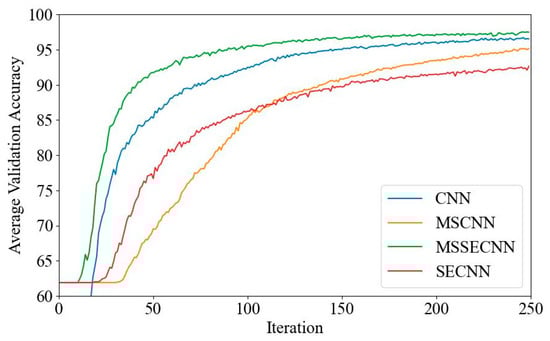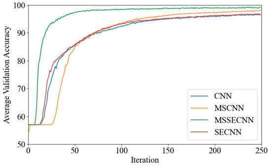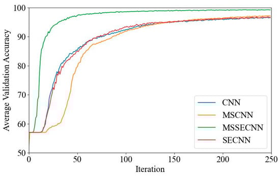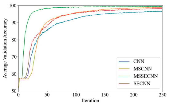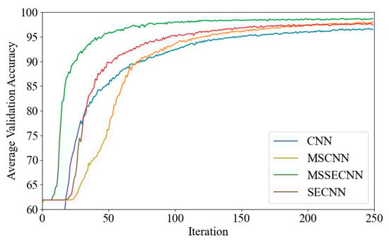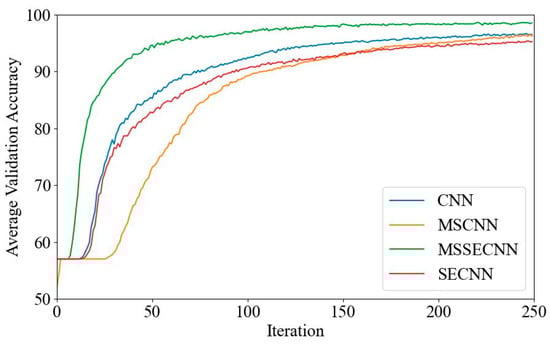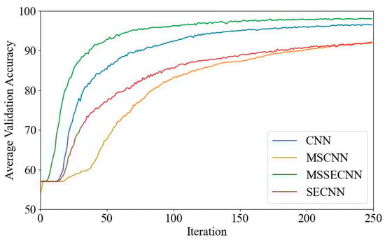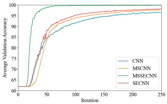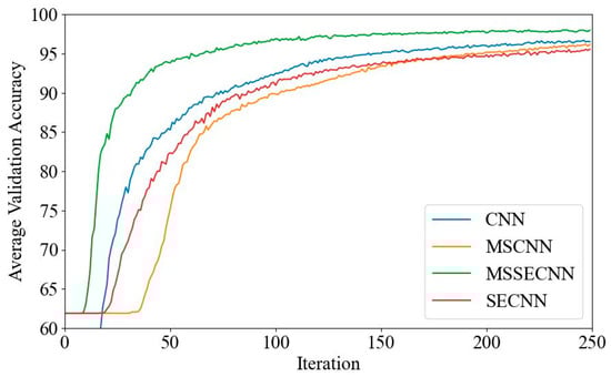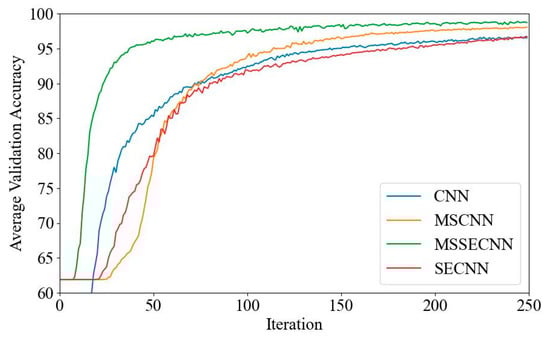 In Figure 6, the CNN model shows the lowest average validation accuracy, stabilizing around 96.5% after 180–200 iterations. The SECNN and MSCNN achieve higher accuracy, stabilizing around 97.5% after 160–180 iterations, while the MSSECNN achieves a stable validation accuracy of 100% within only 60–80 iterations.