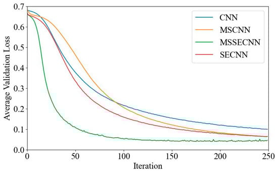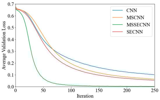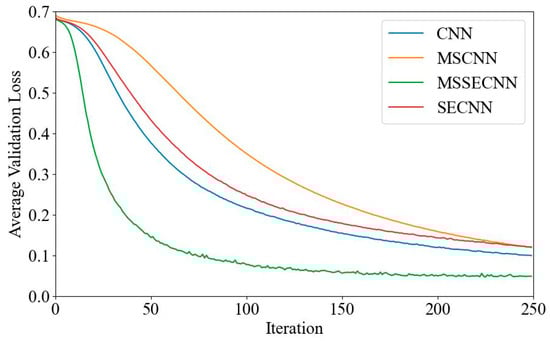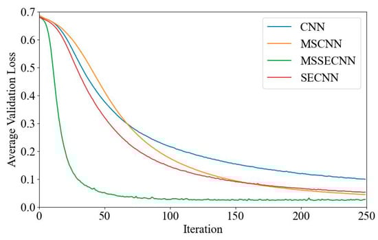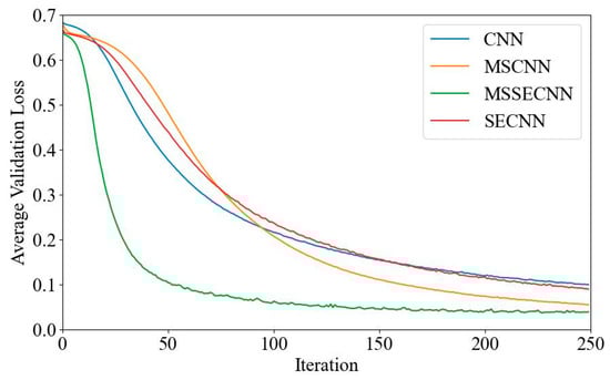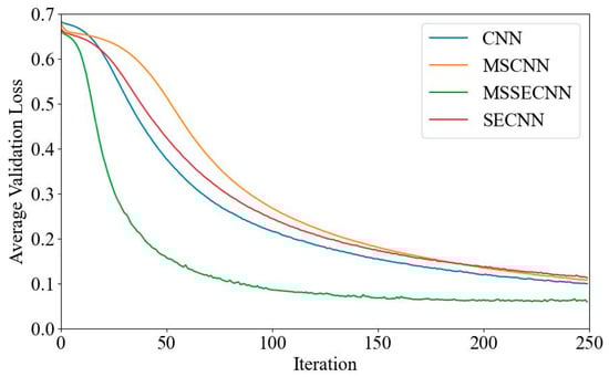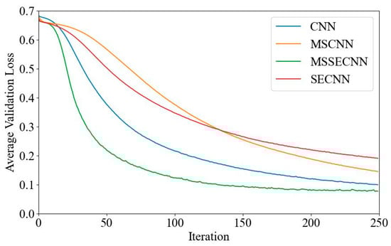 Figure 9 shows the average validation loss curves, with the CNN exhibiting the highest loss, reaching a minimum of approximately 0.11. The SECNN and MSCNN have lower minimum losses, around 0.05, while the MSSECNN achieves the lowest minimum loss of approximately 0.026.