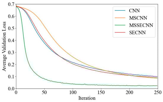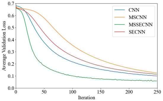 Figure 10 and Figure 11 present the average validation accuracy and loss curves for PCMI features across models. In Figure 10, the CNN and SECNN have relatively lower validation accuracy, stabilizing around 96% after 180–200 iterations. The MSCNN reaches a higher accuracy of approximately 98.1%, while the MSSECNN achieves stability at 99.1% within 60–80 iterations.