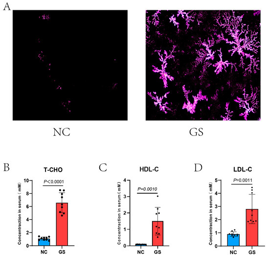 (A) Bile crystals are polygonal in shape and their density was visibly elevated after 8 weeks on the lithogenic diet compared with the NC groups; little bile crystals are visibly scattered. (B–D) Serum T-CHO, HDL-C, and LDL-C values of NC vs. GS: T-CHO: 1.09 ± 0.24 mM vs. 6.58 ± 1.54 mM, HDL-C: 0.09 ± 0.01 mM vs. 1.50 ± 0.83 mM, and LDL-C: 0.90 ± 0.18 mM vs. 2.81 ± 1.11 mM with significant differences of p < 0.0001, p = 0.0010, and p = 0.0011, respectively. A two-tailed Student’s t-test was used for statistical analysis. GS: gallstone group; NC: normal control.