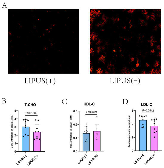 (A) The density of bile salt crystals (magnification at 50×) in the treatment group was statistically significantly lower than that in the sham group. (B–D) Serum T-CHO, HDL-C, and LDL-C values for LIPUS(+) vs. LIPUS(−): T-CHO: 2.41 ± 0.94 mM vs. 3.04 ± 0.87 mM, HDL-C: 0.15 ± 0.05 mM vs. 0.13 ± 0.05 mM, and LDL-C: 2.293 ± 0.50 mM vs. 1.86 ± 0.37 mM with p values of p = 0.1580, p = 0.0542, p = 0.5024, respectively. A two-tailed Student’s t-test was used for statistical analysis.