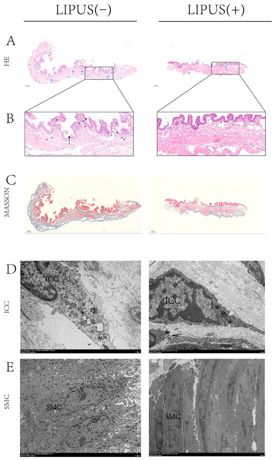 (A,B) Histopathological analysis of gallbladder tissue inflammation at 200× magnification; the inflammatory infiltration of the gallbladder wall was reduced in the treatment group, the infiltration of neutrophil cells (▲) was reduced, tissue edema (→) was improved, and new capillaries (★) were reduced. In addition, the R-A sinus (→) was present in the sham group. (C) Gallbladder Masson staining at 200× magnification shows there is no difference in gallbladder wall fibrosis between the treatment group and the sham group. (D,E) TEM observation of the ICC and SMC structures in guinea pig gallbladders. In the sham group, mitochondria within the ICCs of the gallbladder wall exhibited irregular swelling, the endoplasmic reticulum was markedly swollen, and the nuclear membrane displayed signs of contraction (D, left, 15k×). The morphology of SMCs exhibited deformation, characterized by sparse synaptic structures and the nearly complete disappearance of intracellular reticular structures (E, left, 6k×). M: mitochondrion, ICC: interstitial cell of Cajal, SMC: smooth muscle cell, R-A: Rokitansky–Aschoff. “Supplementary Materials” for pathological figure details.