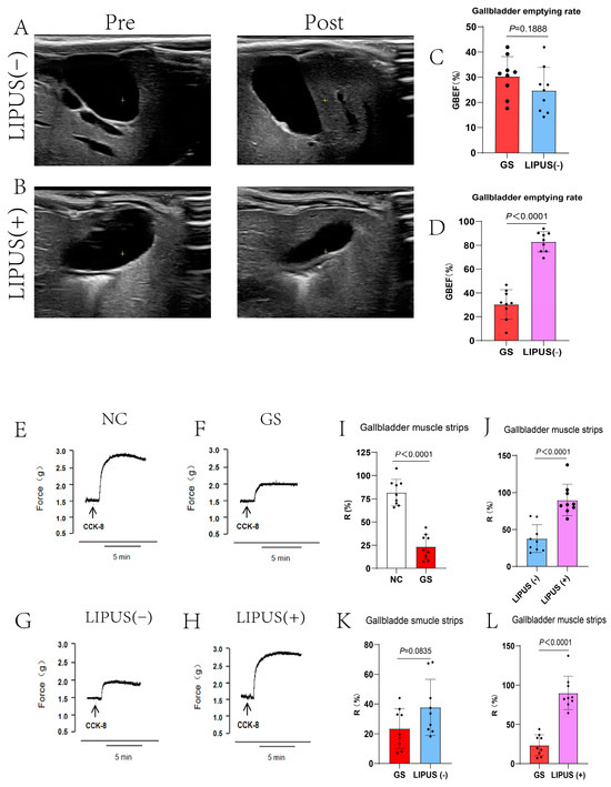 (A,B) Ultrasound evaluation of guinea pig gallbladder contractibility. Pre-injection of CCK-8 (A,B left) and post-injection of CCK-8 (A,B right). Gallbladders in the GS group and the sham treatment group exhibited a minimal response to CCK-8 stimulation (p = 0.1888 vs. GS (C)), whereas the gallbladder rapidly contracted and emptied after CCK-8 injection in the LIPUS(+) group (p < 0.0001 vs. GS (D)). GBEF in the NC, GS, LIPUS(−), and LIPUS(+) groups were, respectively, 92.12 ± 7.41%, 30.36 ± 22.79%, 24.84 ± 9.13%, and 3.02 ± 8.50%. (E–H) Reactivity curve of guinea pig gallbladder smooth muscle strips to CCK-8. The R values in the NC, GS, LIPUS(−), and LIPUS(+) groups were 81.84 ± 14.09%, 23.51 ± 13.38%, 37.74 ± 18.86%, and 89.99 ± 21.25%, respectively, with corresponding p values of p < 0.0001 vs. NC (I), p < 0.0001 vs. LIPUS(−) (J), p = 0.0835 vs. GS (K), and p < 0.0001 vs. GS (L). A two-tailed Student’s t-test was used for statistical analysis.
