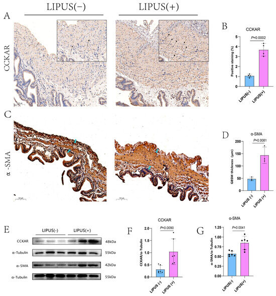 (A) The black arrow shows the CCKAR immunohistochemically positive area of the gallbladder (scale of bar: 100 μm), which was intensively expressed in the LIPUS treatment group (A right). (B) The proportion of CCKAR-positive staining for LIPUS(−) and LIPUS(+) was 1.07 ± 0.16% and 3.69 ± 0.63%, p = 0.002 vs. LIPUS(−). (C) The blue arrow indicates that the continuous deep staining area (scale of bar: 100 μm), which is the smooth muscle layer with positive staining, is clearly thickened in the LIPUS treatment group (C right). (D) The mean thickness of the GBSM in the LIPUS(−) and LIPUS(+) groups was 47.90 ± 7.14 μm and 143.67 ± 33.21 μm, p = 0.0081 vs. LIPUS(−). (E) The protein expression level of CCKAR and α-SMA increased after LIPUS treatment in the CGS model of guinea pigs. (F) The mean grayscale values of CCKAR protein levels in the LIPUS(−) and LIPUS(+) groups were 0.31 ± 0.16 and 1.041 ± 0.53, p < 0.0090 vs. LIPUS(−). (G) The mean grayscale values of α-SMA protein levels in the LIPUS(−) and LIPUS(+) groups were 0.57 ± 0.07 and 0.850 ± 0.17, p = 0.0041 vs. LIPUS(−). A two-tailed Student’s t-test was used for statistical analysis.