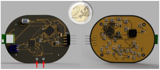 For Bluetooth communication, the RN4871-I-RM130 module was selected, utilizing Bluetooth low energy (BLE) technology to enable short-range wireless communication with low power consumption []. This module supports the Bluetooth 4.2 standard, providing improved data transfer rates, extended range, and better energy efficiency. It communicates with the MCU via the UART interface, making it a popular choice for wearable devices where low-power wireless connectivity is essential, as in the current design. The final design (Figure 2) has dimensions of 60 mm × 45 mm.