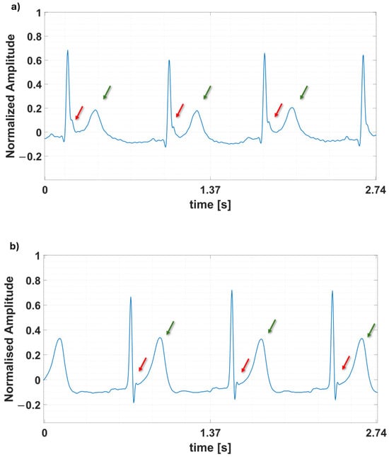 This approach enabled the creation of a final dataset encompassing 83 h and 15 min of acquisition, comprising 2497 diabetic samples and 2498 healthy samples. Figure 4 presents an example of ECG readings for each label in the dataset. The figure highlights key differences, such as a deviation in the ST segment and an asymmetric T-wave morphology in the diabetic ECG, which contrasts with the typical T-wave shape observed in healthy individuals.