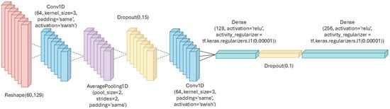 The Swish activation function was used for the 1D-CNN layers instead of the classical ReLU thanks due to its advantages in handling complex data more efficiently, and avoiding issues such as the “dying ReLU” problem. Swish is characterized by a smooth, sigmoid-like curve that allows for a more gradual and continuous increase in output, which helps prevent neurons from becoming inactive during training—a common issue with ReLU, where neurons can output zero and fail to contribute to learning []. Additionally, average pooling was employed instead of max pooling, as it preserves more contextual information by considering all values within a region. This reduces the risk of losing critical details, making the network more robust to small variations in the input and providing a more stable representation of the feature map. Lastly, dropout was incorporated to mitigate potential overfitting, especially given the limited number of diabetic patients in the dataset.