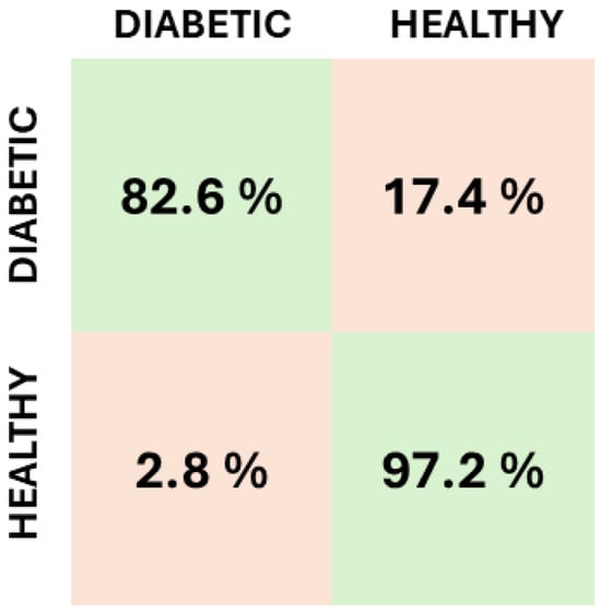 Another study [] introduced a method for classifying diabetic and non-diabetic ECG signals using 5 s single-lead ECG segments. After extracting and ranking ten features, they found that a medium tree classifier could achieve an accuracy of 87.19%. This demonstrates the feasibility of classifying diabetes based on short ECG recordings. However, the computational complexity of more advanced signal processing methods, such as the one introduced by Jain et al. [], remains a challenge for wearable applications.