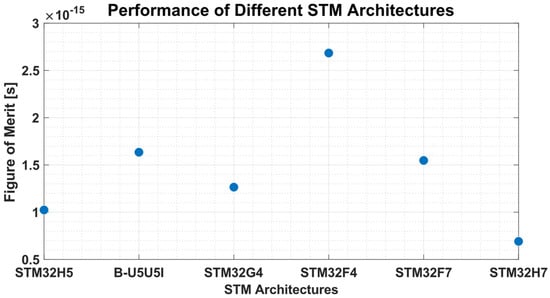 In this regard, the selected microcontroller belongs to the F4 series, and it was chosen from several 32-bit microcontrollers across different ARM architectures, including M4, M7, and M33. Specifically, the F7, H7, H5, U5, G4, and F4 were benchmarked using the ST Edge AI Developer Cloud (2.0.0) [] tool. These microcontrollers were ranked based on a figure of merit (FOM), as described by Equation (1), which summarizes the trade-off between power dissipation and inference time (ti). While a microcontroller with a higher clock frequency is expected to produce results with lower latency (ti ∝ fclk), it is also expected to have higher energy consumption (power dissipation ∝ fclk2).
