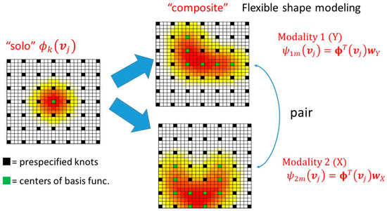 Dimension reduction based on the basis function was followed by the application of the SSMA method. Thus, the result is obtained as a linear combination of the basis functions and , which is referred to as a composite function (Figure 1). and are paired because of the hierarchical structure. This can be regarded as a paired composite function, which represents related brain regions across modalities. The composite basis can exhibit a flexible shape, whereas the original basis function maintains a spherical shape.