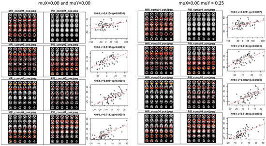 Figure 3 illustrates the spatial pattern and correlation among scores by components for cases and . Four components were selected for both cases. The first component exhibited the highest correlation with a composite score, influenced by the supervised nature of the analysis. In the second component, a relationship that makes sense from a biological perspective was found, suggesting that the data reflect known anatomical or functional relationships in the brain. The spatial pattern included the hippocampal and parahippocampal regions for MRI, while peak values for PiB data were observed in the posterior cingulate and precuneus. These are considered reasonable areas based on previous studies, and further description will be given in the discussion section. For all components, except for the second one in the case of the relationships among scores were stronger than those observed in the case of .