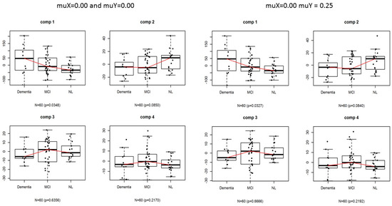 Thus, the case represents a strong effect of the score on the observed data, and the case () represents a weak effect. Thus, only the Y-score for the second component is associated with the outcome.