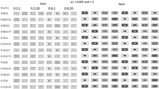 The average values of the c-index were derived from 100 simulations, using various parameter combinations, specifically along with , and . These parameters influence how the model behaves and the results it generates. The results are summarized in Table 1 and Table 2 for . Notably, to facilitate interpretation, is displayed as the inverse . The results were divided into X and Y, with the c-index for each component listed. The average values from the two components are presented in the third and sixth columns, while the last column displays the average value for both X and Y across the two components. The highest mean value among and for each and is highlighted in bold. Figure 5 illustrates the 2D displays of the resulting probabilities for Y and X for . These probabilities are computed from the pixel-wise mean value of the binary images, indicating whether a pixel is selected in the estimation.