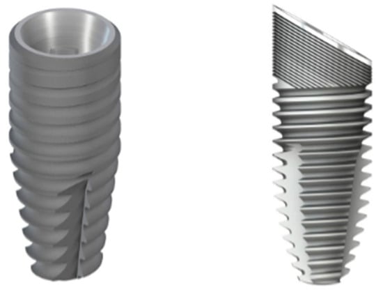 Image of the implants used in this study; ø 4.1 × 10 mm BLT (left), ø 4.1 × 10 mm Quattrocone (right).