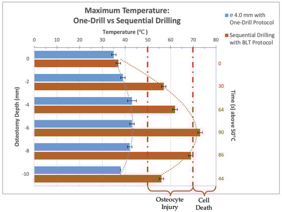 Bar graph showing maximum temperatures reached when drilling into bone to a depth of 10 mm with the 4.0 mm diameter drill bit used in a one-drill protocol compared to the Straumann BLT drill bits used in series. The temperature range of bone cell injury and cell death are marked on the graph. The left axis shows drilling depth (mm), while the top axis shows the maximum temperature reached (°C) at that depth. The right axis shows the duration (s) when temperatures exceeded 50 °C.