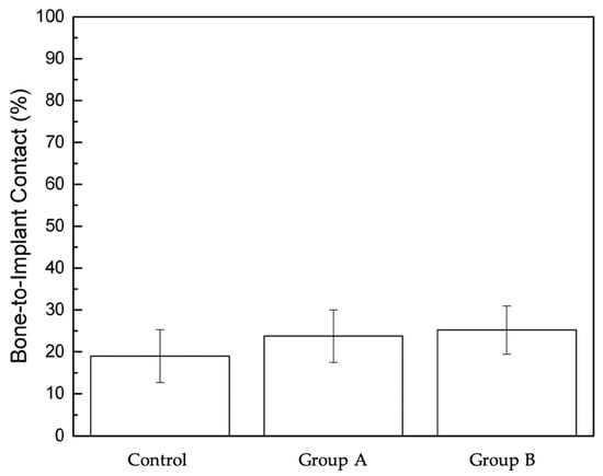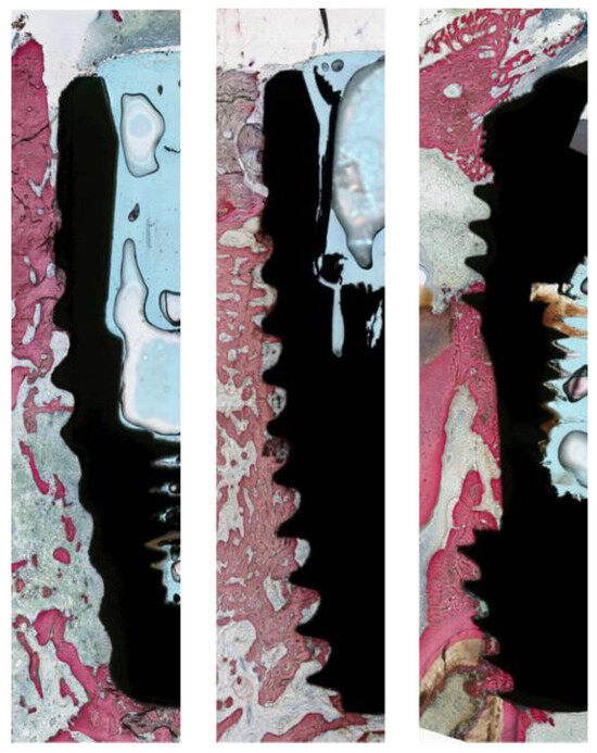 Tissue collection and processing: At the end of the three-week experimental period, the animals were euthanized by veterinary staff via intravenous administration of pentobarbital sodium (100–150 mg/kg). Histological samples were then prepared and blindly analyzed by New York University Department of Biomaterials and Biomimetics (New York, NY, USA), as written by Donath et al. []. The specimens were kept in 10% buffered formalin solution for 24 h. Specimen blocks, each containing a single implant, were washed in distilled water and gradually dehydrated from 70% to 100% ethanol. Once dehydrated, the specimens were embedded in a methacrylate-based resin (Technovit 9100; Heraeus Kulzer GmbH, Hanau, Germany) and then cut into slices about 300 μm thick with a diamond saw (Isomet 2000; Buehler Ltd., Lake Bluff, IL, USA) along the long axis of the implant through its center, glued onto acrylic plates with acrylic adhesive (Aron Alpha Industrial Krazy Glue; Elmer’s Products, Inc., Columbus, OH, USA), and allowed to cure for 24 h. Processing was then continued with sequential grinding and polishing using abrasive papers with increasing grit size (400, 600, 800, 1200, and 2400; Buehler Ltd.), coated with silicon carbide, and irrigated on a grinding machine until sections achieved a final thickness of about 30 μm. The sections were then stained with Stevenel’s Blue and Van Giesons’s Picro Fuschin (SVG) stains and scanned with an automated slide scanning system and specialized computer software (Aperio Technologies, Vista, CA, USA). For histomorphometric evaluation, an imaging analysis software (ImageJ, NIH, Bethesda, MD, USA) was used to quantify and evaluate osseointegration parameters around the peri-implant surface: bone-to-implant contact (BIC) [,,,]. Statistical evaluation of BIC was performed using the Kruskal–Wallis test. Statistical significance was set at 95%, and post hoc testing for multiple comparisons used the Dunn test. The analysis was randomized with the group labels being anonymized so that the analysts were unaware of which labels corresponded to the treatment or control group.