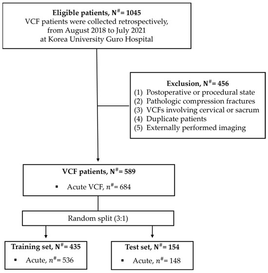 This retrospective study was authorized by the Institutional Review Board (IRB) of Korea University Guro Hospital and conformed to the Helsinki Declaration. The study cohort for benign VCFs was created by searching the institutional Picture Archiving and Communication System (PACS) database for CT scans of the lumbar or thoracic spine performed between August 2018 and July 2021. Reports containing the keywords “compression fracture”, “burst fracture”, or “compression deformity” were included in the search. A total of 1045 patients were initially identified. The exclusion criteria were as follows: (1) any postoperative or procedural state involving spinal surgery, including the insertion of bone cement or metallic hardware; (2) pathological compression fractures caused by infections or tumors; (3) cervical spine or sacral fractures; (4) duplicate imaging of the same patient; and (5) external imaging.