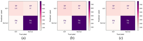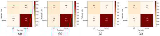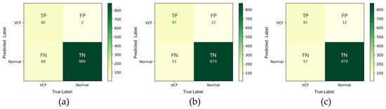 In evaluation method 2, the TP count of HLR(−) + EEVD was 120, indicating a strong ability to identify positive cases (Figure 7). However, the FP (87) was relatively high, indicating a tendency for overdiagnosis. The TN (795) was also high, suggesting that the model exhibited reasonable specificity in correctly identifying negative cases. The HLR(−) + TSVD_SD demonstrated an increase in TP (130), reflecting improved sensitivity compared to the HLR(−) + EEVD model. This version also had a reduced FN (18). However, the FP increased to 98, suggesting a potential drawback in terms of specificity. The TN (784) was lower compared to the HLR(−) + EEVD model, implying that while the model improved its ability to detect positive cases, this improvement came at the cost of reduced specificity. The HLR(−) + TSVD_DC model exhibited a TP count of 126 and an FN count of 22. The FP (94) and TN (788) suggested that the model attempted to achieve a middle ground, reducing false positives compared to the HLR(−) + TSVD_SD. HLR(−) + TSVD_DC appeared to offer a balance between sensitivity and specificity, resulting in a robust classification performance that minimized both false negatives and false positives to an extent.