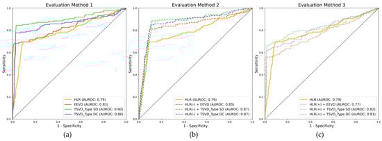 ROC curves of three different evaluation methods. (a) Evaluation method 1, (b) Evaluation method 2, and (c) Evaluation method 3. The yellow solid line means standalone HLR.