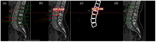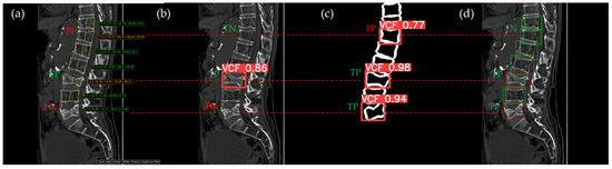 In Figure 10, the acute VCF was present only at the L2 level, characterized by morphological features of an anterior cortical step-off. With the HLR method, the result was an FN, whereas EEVD, TSVD_SD, and TSVD_DC correctly identified it as a TP.
