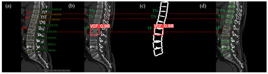 Figure 10, Figure 11, Figure 12, Figure 13 and Figure 14 illustrate typical examples of results for HLR, EEVD, TSVD_SD, and TSVD_DC in patients with acute VCFs. The results of applying different methodologies to the same patient image and identical slice locations were as follows. In the HLR results, each vertebra was marked with yellow solid lines indicating the height measurement lines for the anterior, middle, and posterior regions. The measured height values and HLR percentages were displayed on the right side of the image. If the HLR percentage ranged between 25% and 40%, it was highlighted in orange, while values of 40% or higher were highlighted in red. In the EEVD results, the VCF detection outputs were displayed along with their respective confidence scores based on the input patient images. For the TSVD_SD results, after performing spine segmentation, the model extracted only the spine contour, and the VCF detection results with their corresponding confidence scores were presented. In the TSVD_DC results, bounding boxes were generated for each vertebral body, with normal vertebrae represented in green and vertebrae identified as VCFs displayed in red.