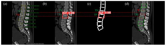 The VCF detection results from four different methods. (a) HLR, (b) EEVD, (c) TSVD_SD, and (d) TSVD_DC. The acute VCF, as confirmed by the radiologist, was only located at the L2 level. TP, TN, FP, and FN were marked at the same level with a red dotted line. FP occurred at the thoracic vertebrae only with the HLR.