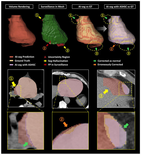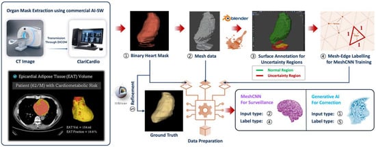 For the purpose-specific data preparation for training and evaluation of the ASHSC algorithm, a commercial and two open-source software programs were used (Figure 2). Firstly, to train and evaluate the suggested algorithm handling the Seg-Hallucination, binary mask of the heart was obtained for inclusion datasets using dedicated AI-based software (ver. 1.0, ClariCardio, ClariPi Inc., Seoul, Republic of Korea, https://claripi.com/claricardio, accessed on 1 December 2024). After an extraction of binary heart mask, technologists modified the prediction masks aligning with ideal organ shape to generate a paired AI-predicted organ mask and the ground truth. The modification software was an opensource software (ver. 5.6.2, 3D Slicer, Boston, MA, USA, http://www.slicer.org, accessed on 3 December 2024) [22]. Secondly, for preparation of the training data in the surveillance model, open-source mesh-handling software (ver. 4.3, blender, Blender Foundation, Amsterdam, The Netherlands, https://www.blender.org, accessed on 3 December 2024) was utilized. The binary masks were transformed into mesh-type data, and it underwent an annotation of the poorly segmented surface areas identified as uncertainty regions. As an additional task for deep learning training, the individual edges within the mesh data obtained from the Blender software were labeled as either normal regions or uncertainty regions, each as a separate learning class. For the correction model training, volumetric organ masks of the training 210 cases were redefined only for the normal organ regions, excluding the uncertainty regions annotated in the training data of surveillance model.